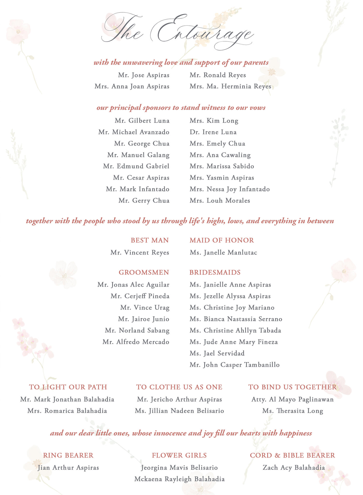 The dress code for our wedding is semi-formal for guests. You can check the Attire Guide page for more details and outfit inspo.For the entourage, the dress code is formal. Please refer to the fabric swatch provided for your attire.